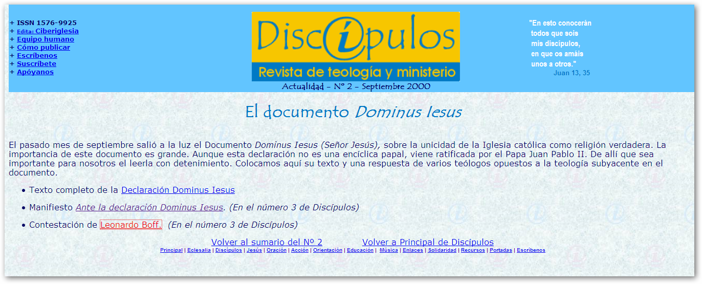 El pasado mes de septiembre salió a la luz el Documento Dominus Iesus (Señor Jesús), sobre la unicidad de la Iglesia católica como religión verdadera. La importancia de este documento es grande. Aunque esta declaración no es una encíclica papal, viene ratificada por el Papa Juan Pablo II. De allí que sea importante para nosotros el leerla con detenimiento. Colocamos aquí su texto y una respuesta de varios teólogos opuestos a la teología subyacente en el documento.